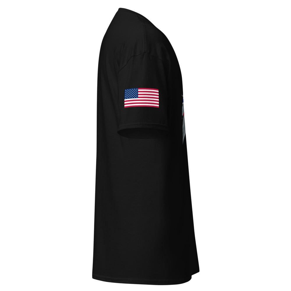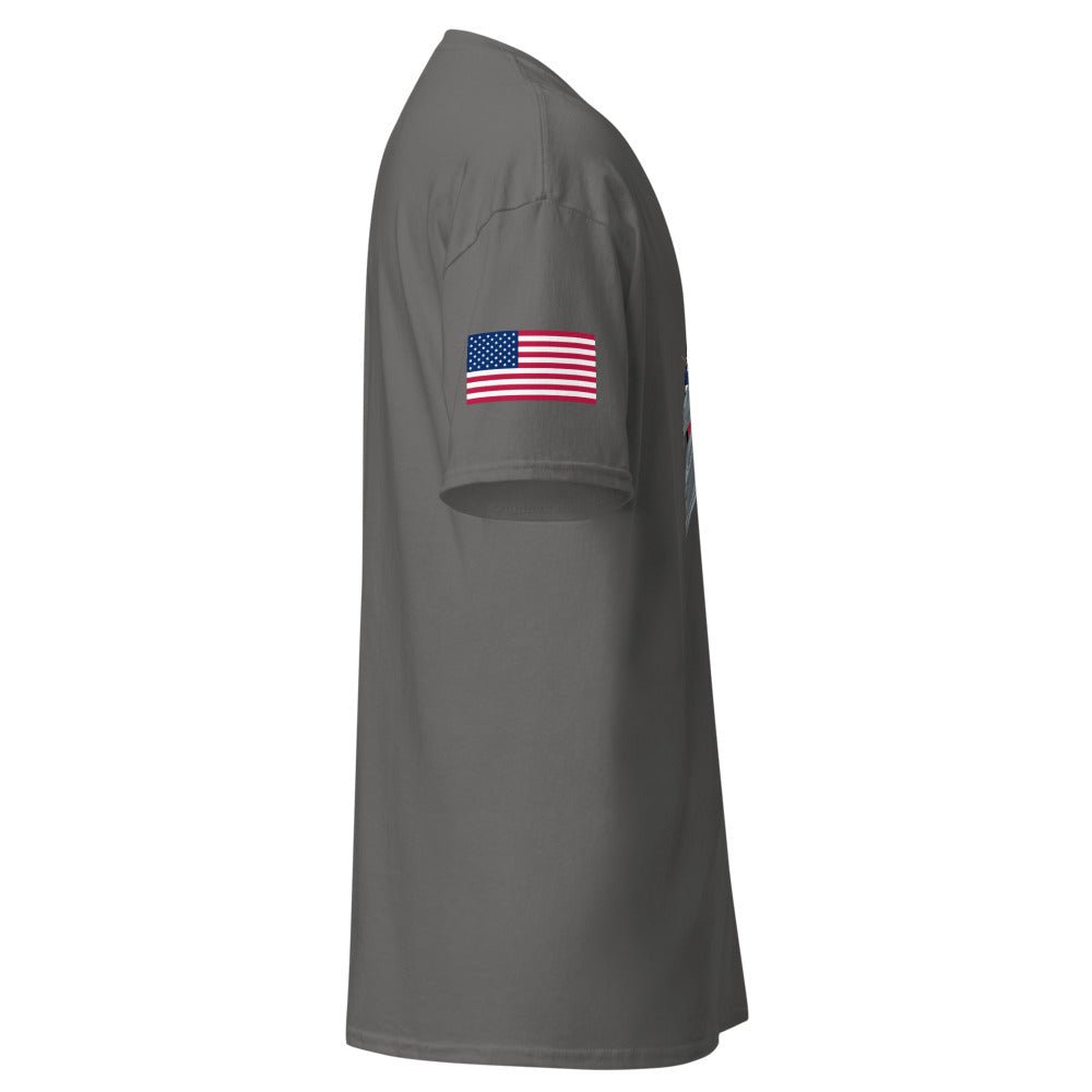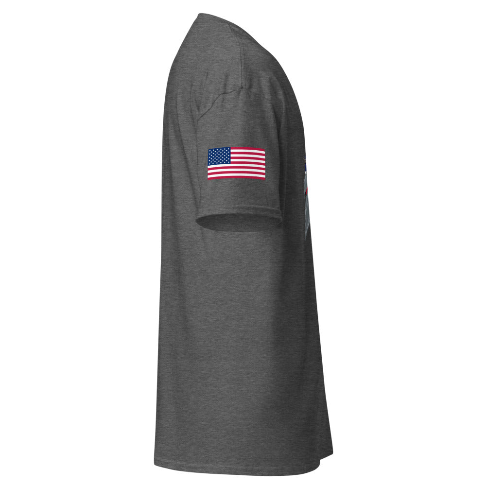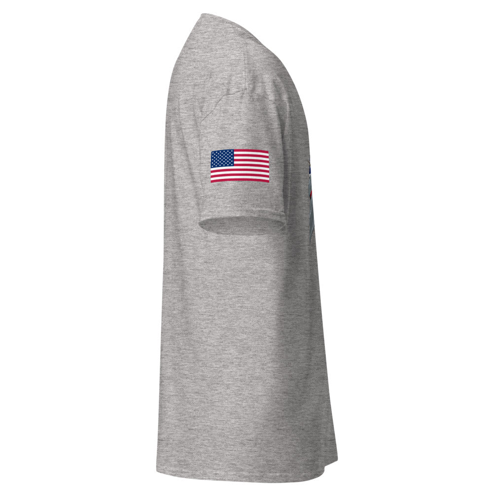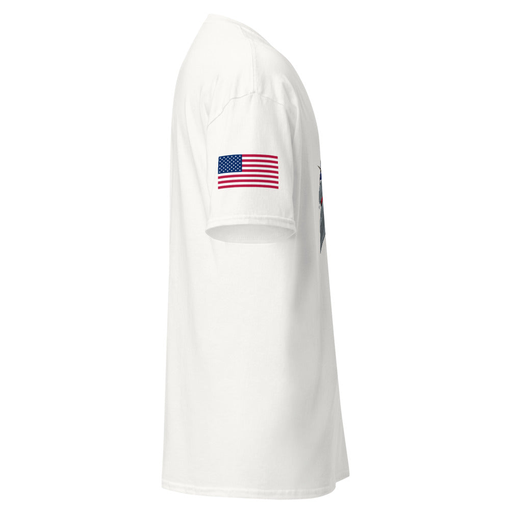Place the end of the tape beside the collar at the top of the tee (Highest Point Shoulder). Pull the tape measure to the bottom of the shirt.