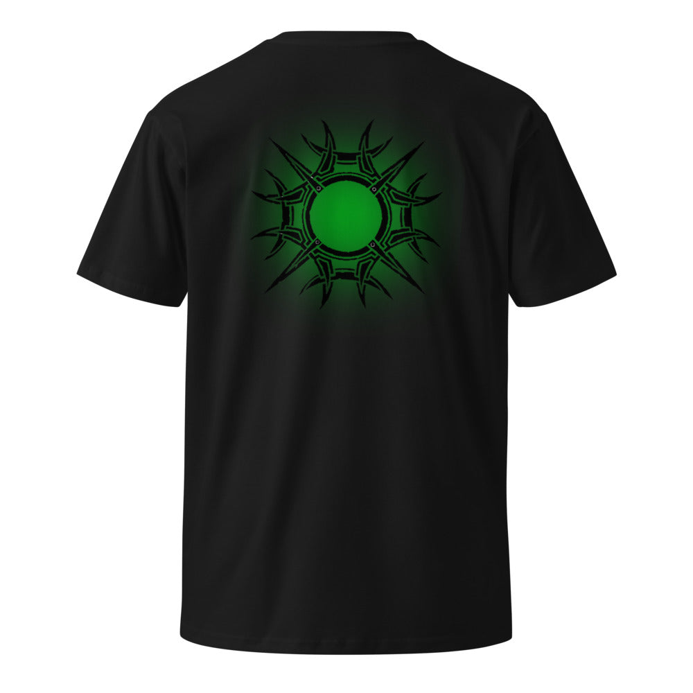 Place the end of the tape beside the collar at the top of the tee (Highest Point Shoulder). Pull the tape measure to the bottom of the shirt.