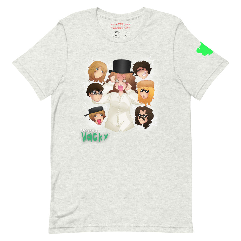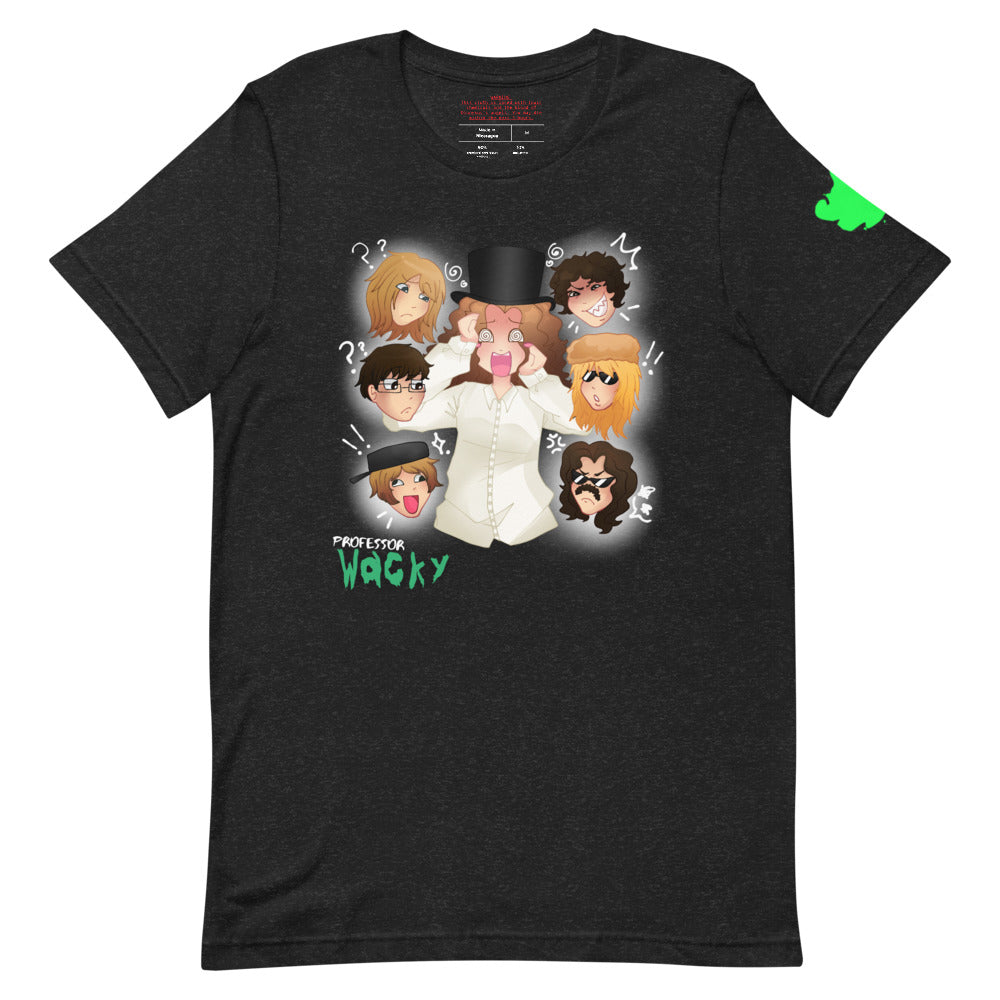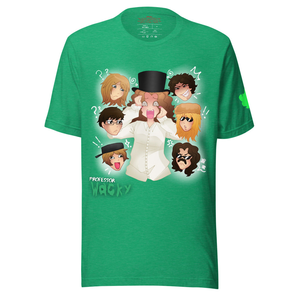 Now you can FINALLY WEAR Professor Wacky and the gang on this premium high quality T-shirt, featuring art done by the talented @mary_estreyah! This T-shirt also features a green splash of an acidic substance on the left sleeve, alongside with a very very honest label on the inside of the collar.