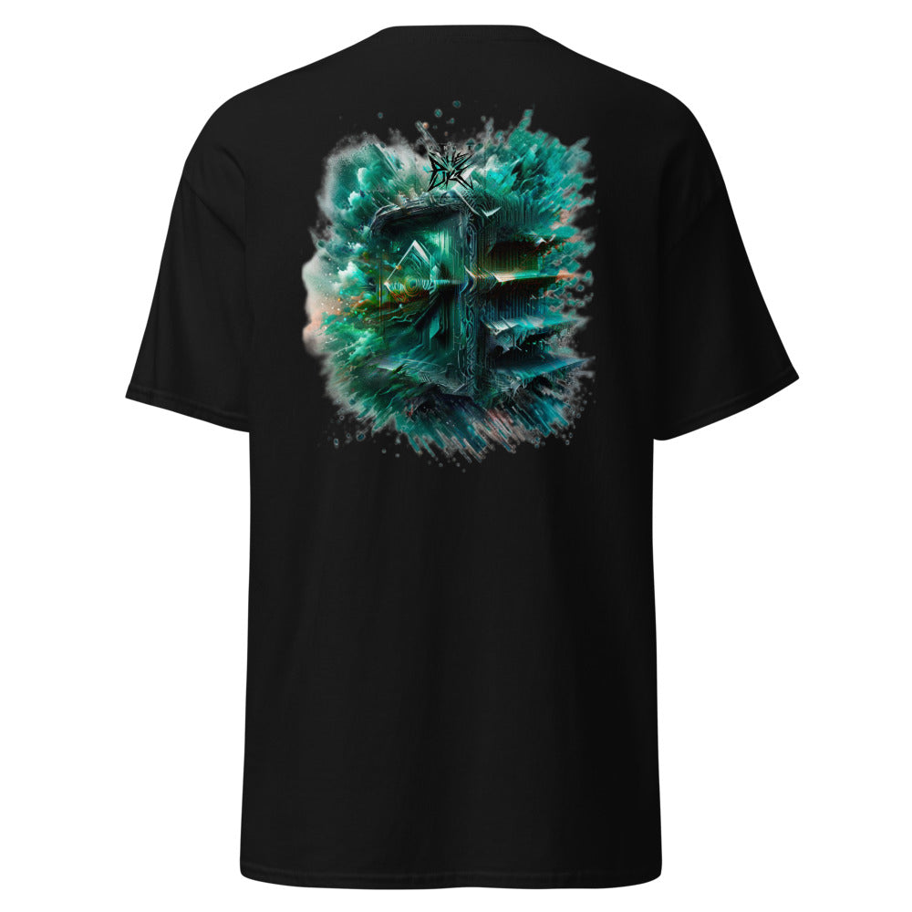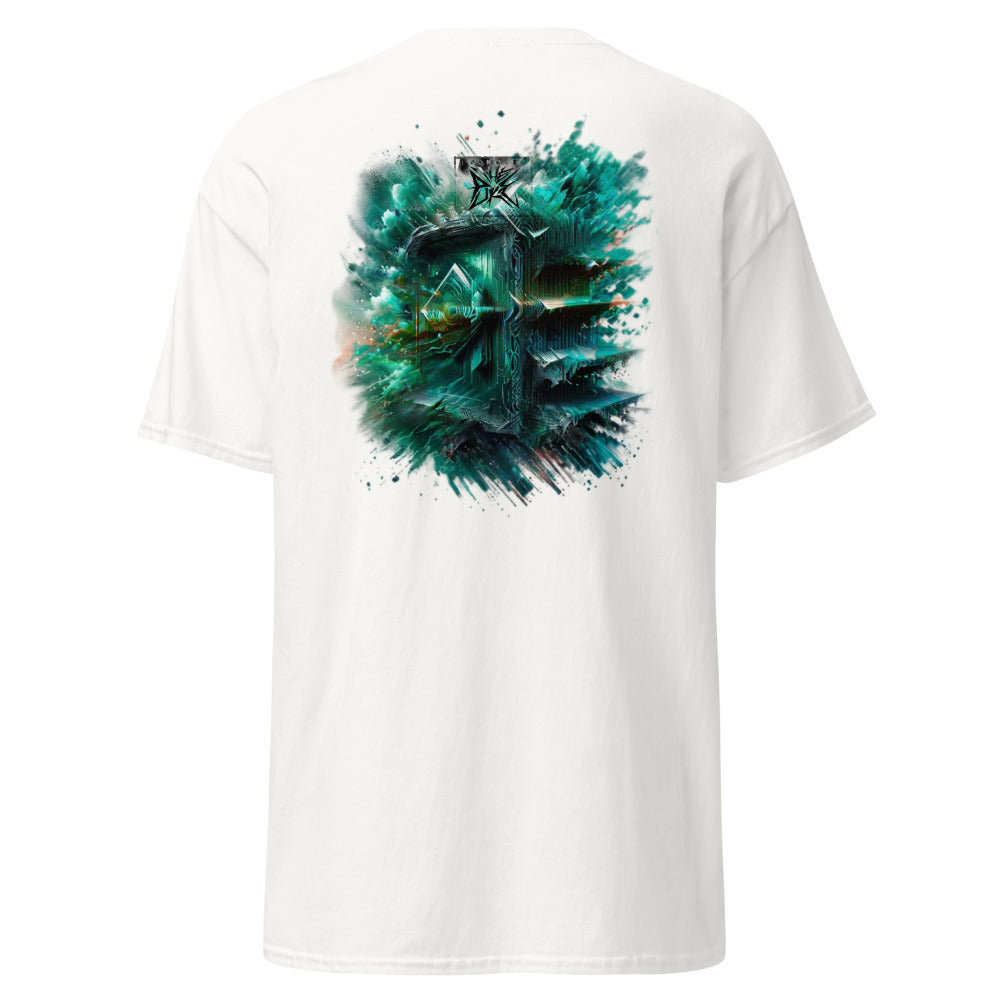 Place the end of the tape beside the collar at the top of the tee (Highest Point Shoulder). Pull the tape measure to the bottom of the shirt.