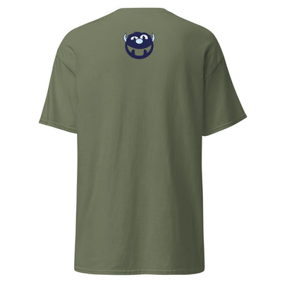 Place the end of the tape beside the collar at the top of the tee (Highest Point Shoulder). Pull the tape measure to the bottom of the shirt.