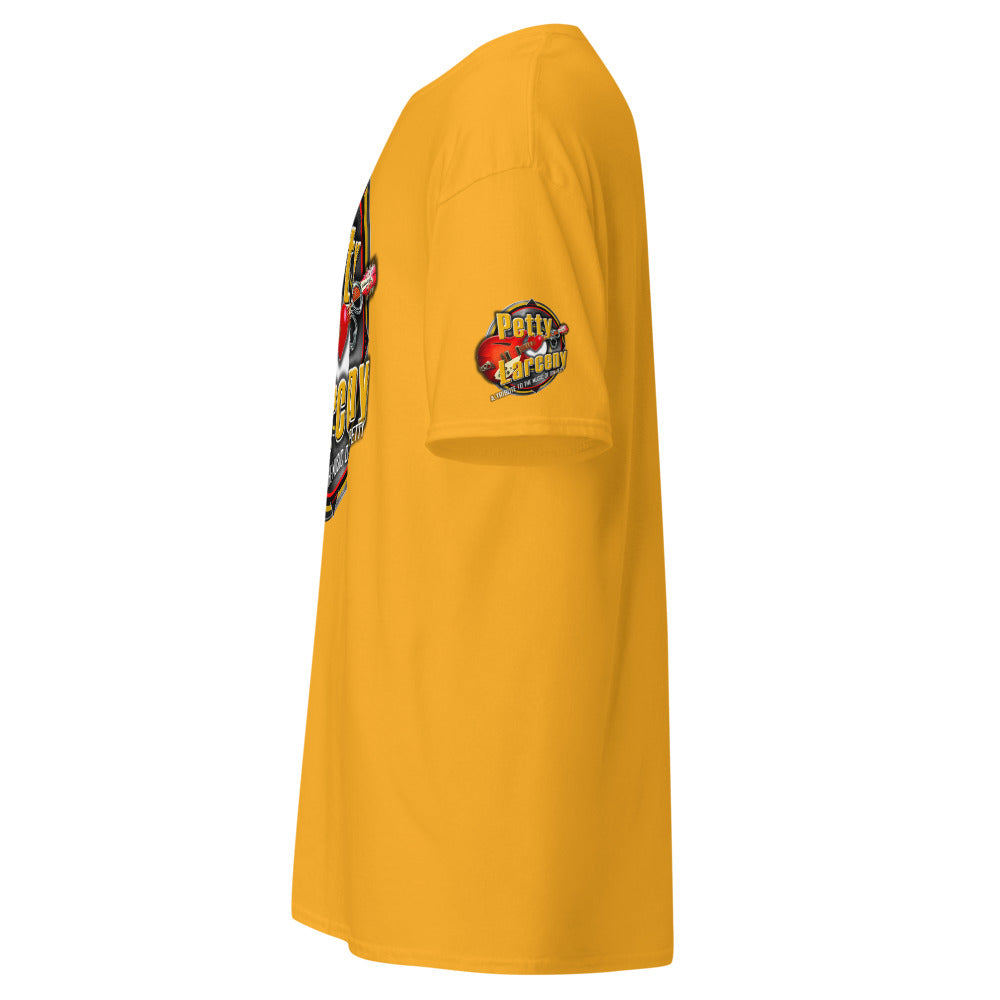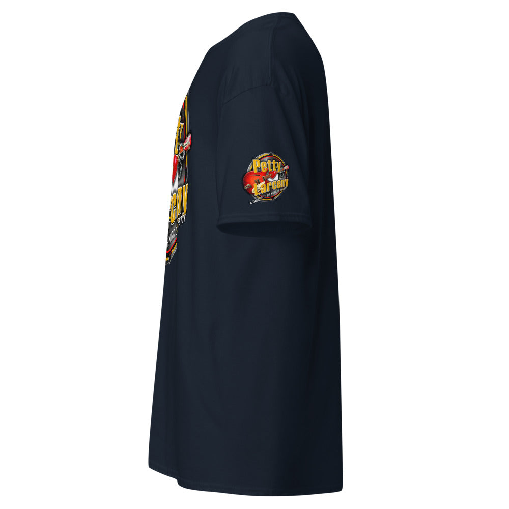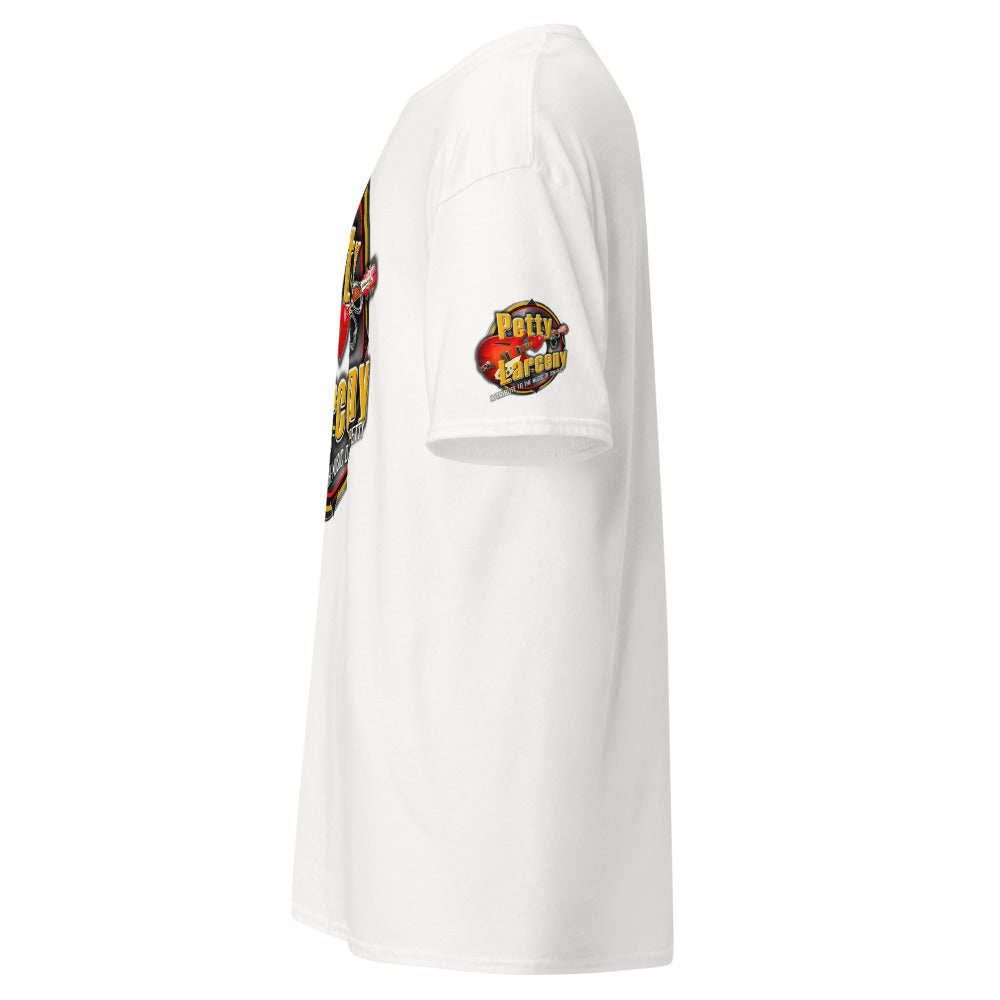 Place the end of the tape beside the collar at the top of the tee (Highest Point Shoulder). Pull the tape measure to the bottom of the shirt.