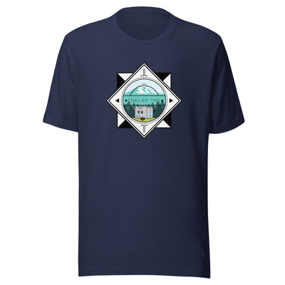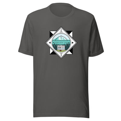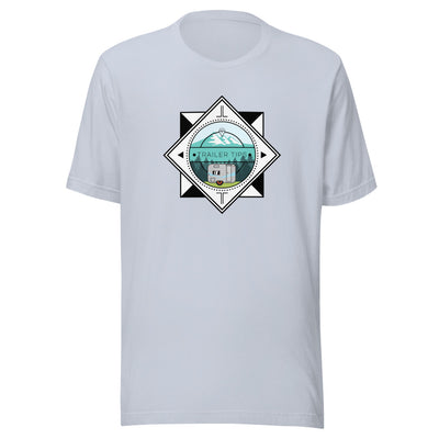 Place the end of the tape beside the collar at the top of the tee (Highest Point Shoulder). Pull the tape measure to the bottom of the shirt.
